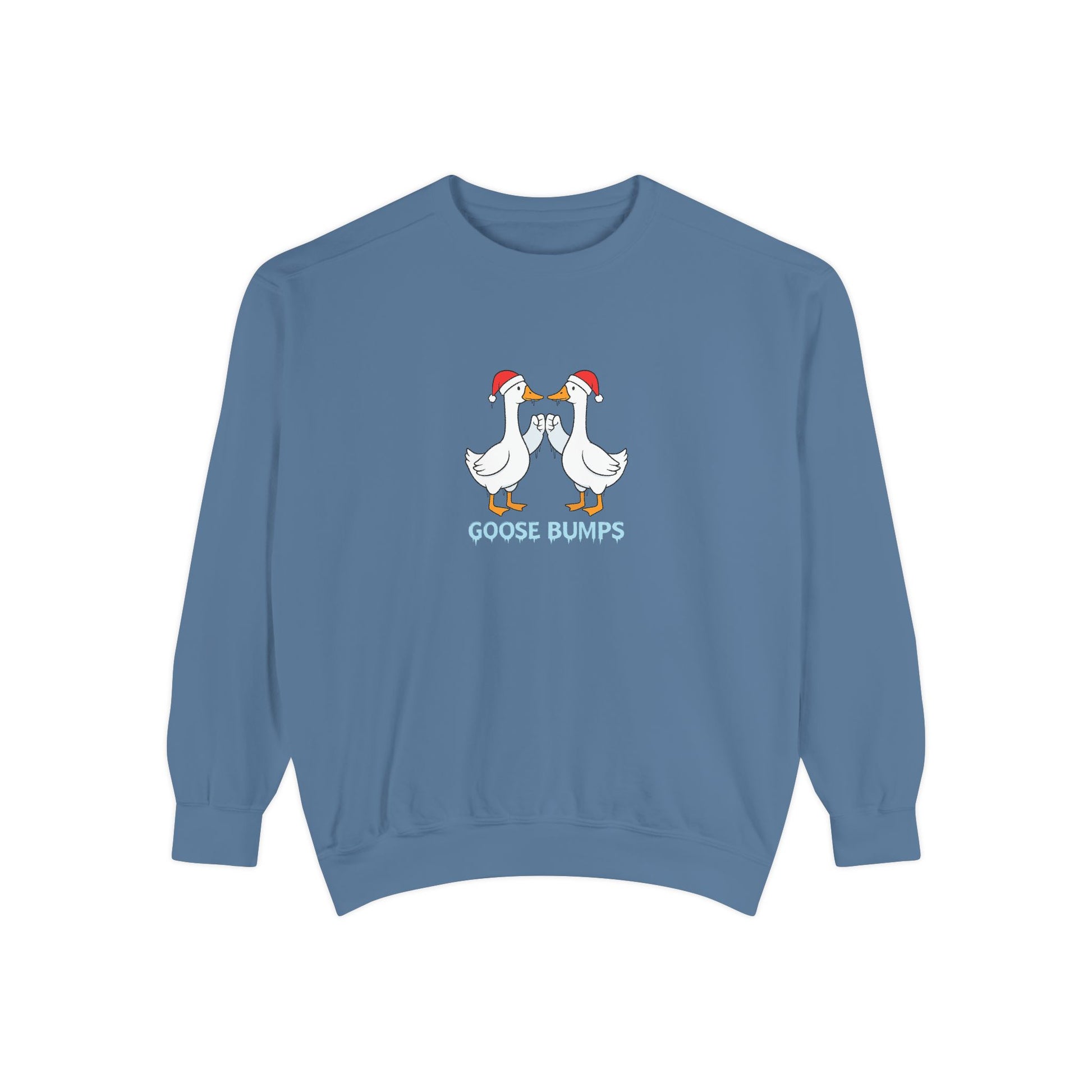 This festive sweatshirt features two geese wearing Santa hats and icicles hanging from their wings, with the words "Goose Bumps" in an icy font below them. Perfect for those who love quirky holiday designs and unique winter-themed apparel. Great for Christmas parties, winter celebrations, or just adding a fun touch to your wardrobe.